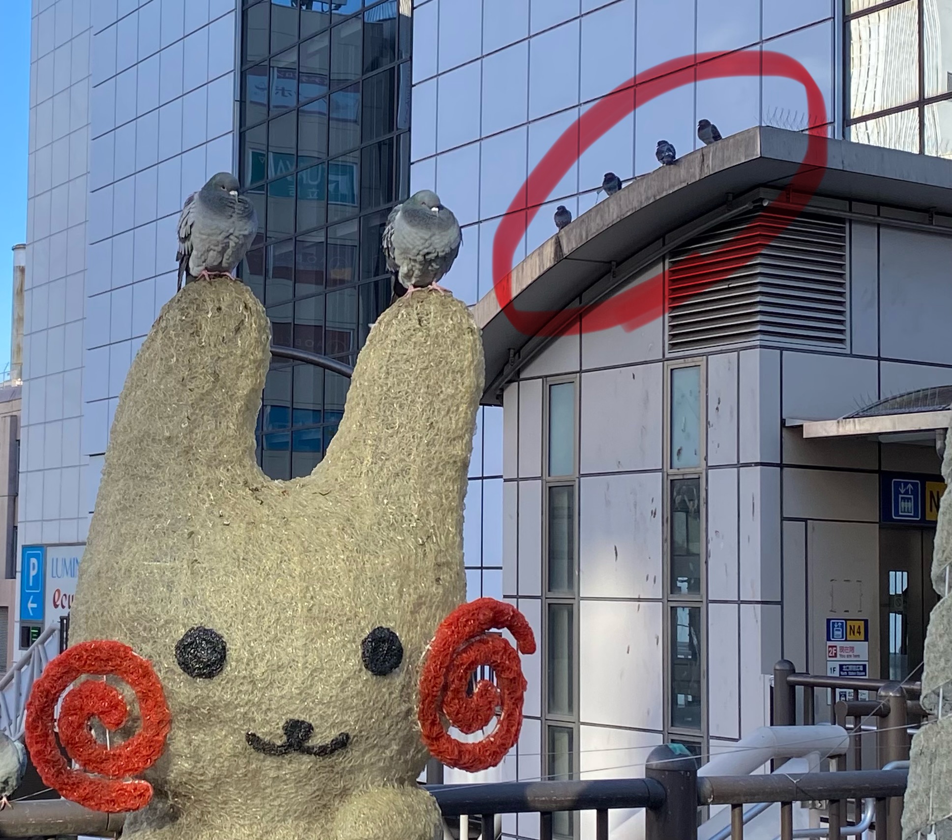 駅の近くに”くるりん”と”ウドラー”がいるのですが、いい具合にハトの休憩場所となっています。